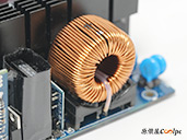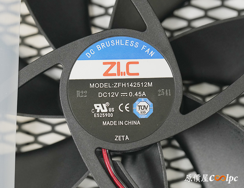 拆開電源可以查看風扇型號ZFH142512M,風扇搭載H.D.B.軸承,搭配導流板讓氣流集中強化散熱效果。