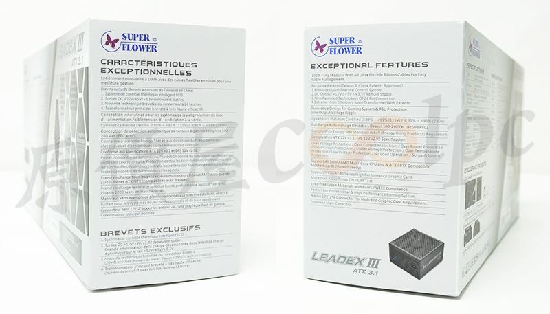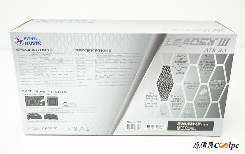 包裝維持LEADEX III系列的經典灰銀配色,有電源供應器的彩色圖照與LEADEX III字樣可以參考,不過這次的是符合ATX3.1規範,CYBENETICS/CYBENETICS 230V白金效率的版本,另外還有很多細節特色藏在封面,像是PCIe 5.1 Ready、Zero dB風扇模式、能承受200%峰值功耗等字樣。