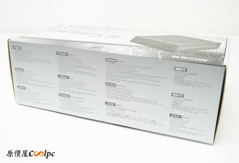 左右兩側分別是西班牙文與英文的特色介紹,寫得相當詳細啊!抓幾個重點來看就是100%全模組,24Pin有振華獨家旋轉接頭設計,CYBENETICS白金/CYBENETICS 230V白金效率,APFC主動功率因數校正,8項電源保護,原生12V-2×6輸出,日系主電容等。