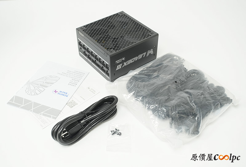 內容物包含LEADEX III 850W電源、模組化電源線材包、POWER CORD、安裝螺絲、說明書、保固卡。