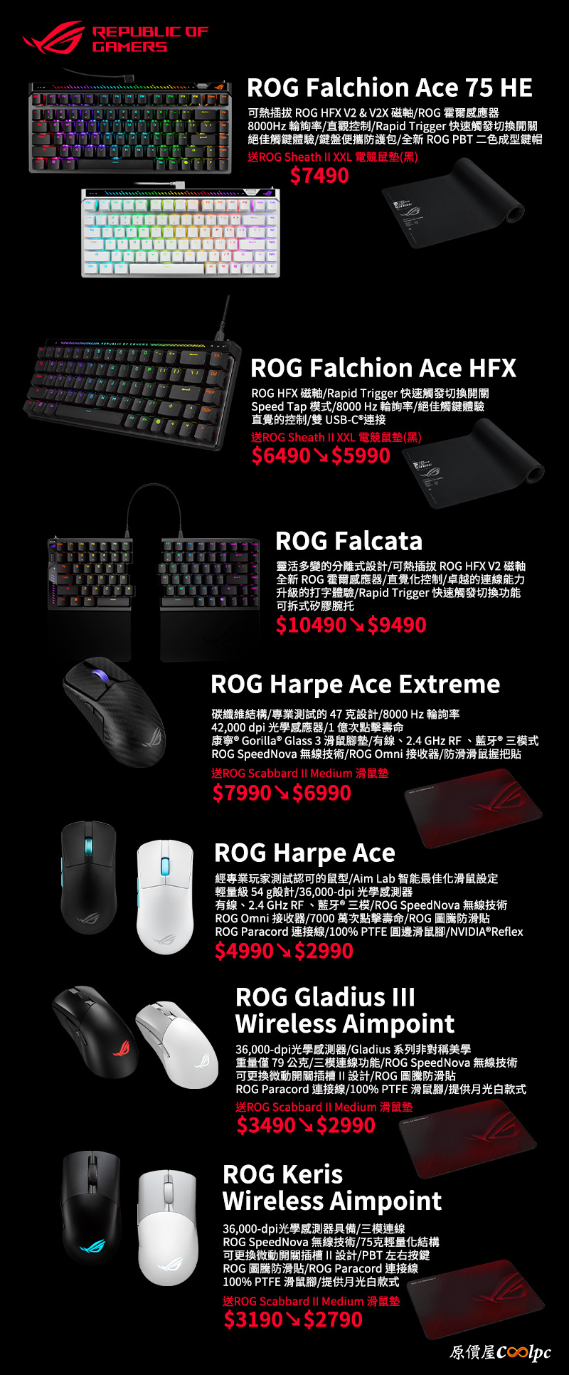 同一時間還有多款ROG電競周邊促銷中,像是輸出快如閃電的ROG FALCHION ACE 75 HE、ROG FALCHION ACE HFX鍵盤,搭載Rapid Trigger快速觸發開關設計,具備8000Hz超高輪詢率,兩款都送ROG SHEATH II XXL電競滑鼠墊,後者還小折五百元呢。或是可以一分為二的ROG FALCATA分離式鍵盤,多元的功能與使用方式,輕鬆發揮1+1>2的效果,而且他也能透過Rapid Trigger技術快速觸發,現在直接折價一千!有鍵盤當然少不了滑鼠,這次有最頂級的ROG HARPE ACE EXTREME,輕量47g滑動有如電光石火般迅速,搭配8000Hz高速輪詢,點擊壽命高達1億次,這回折價千元再送ROG SCABBARD II MEDIUM滑鼠墊。另一款ROG HARPE ACE外型經過專業玩家測試認可,Aim Lab智能最佳化設定,可以說專為遊戲而生,而且還便宜兩千元很划算。最後兩款ROG GLADIUS III WIRELESS AIMPOINT、ROG KERIS WIRELESS AIMPOINT都可更換微動開關,三模連線+SpeedNova無線技術加持,這兩款都有黑白色可選,目前折價百元再送ROG SCABBARD II MEDIUM滑鼠墊,喜歡的玩家都別錯過了。