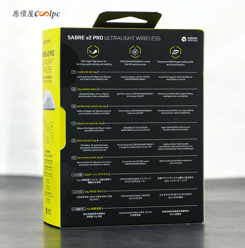 經典 Corsair 黃黑配色外盒,正面直接展示「SABRE V2 PRO Ultralight」本體與型號,視覺上相當簡潔俐落,也強調這款滑鼠主打超輕量定位。