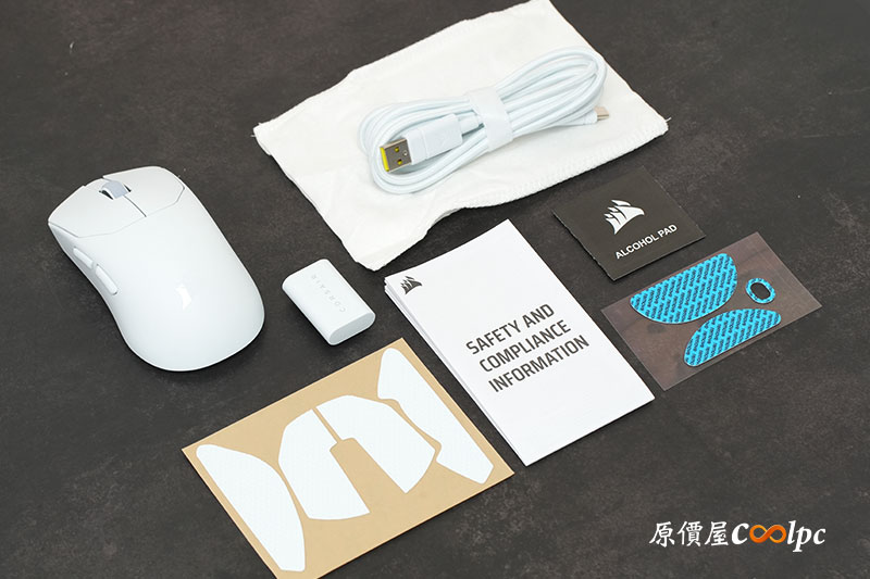 內容物相當完整,除了滑鼠本體外,還包含傳輸線、8K 接收器、替換腳貼與止滑貼等配件,對於進階玩家來說誠意十足。