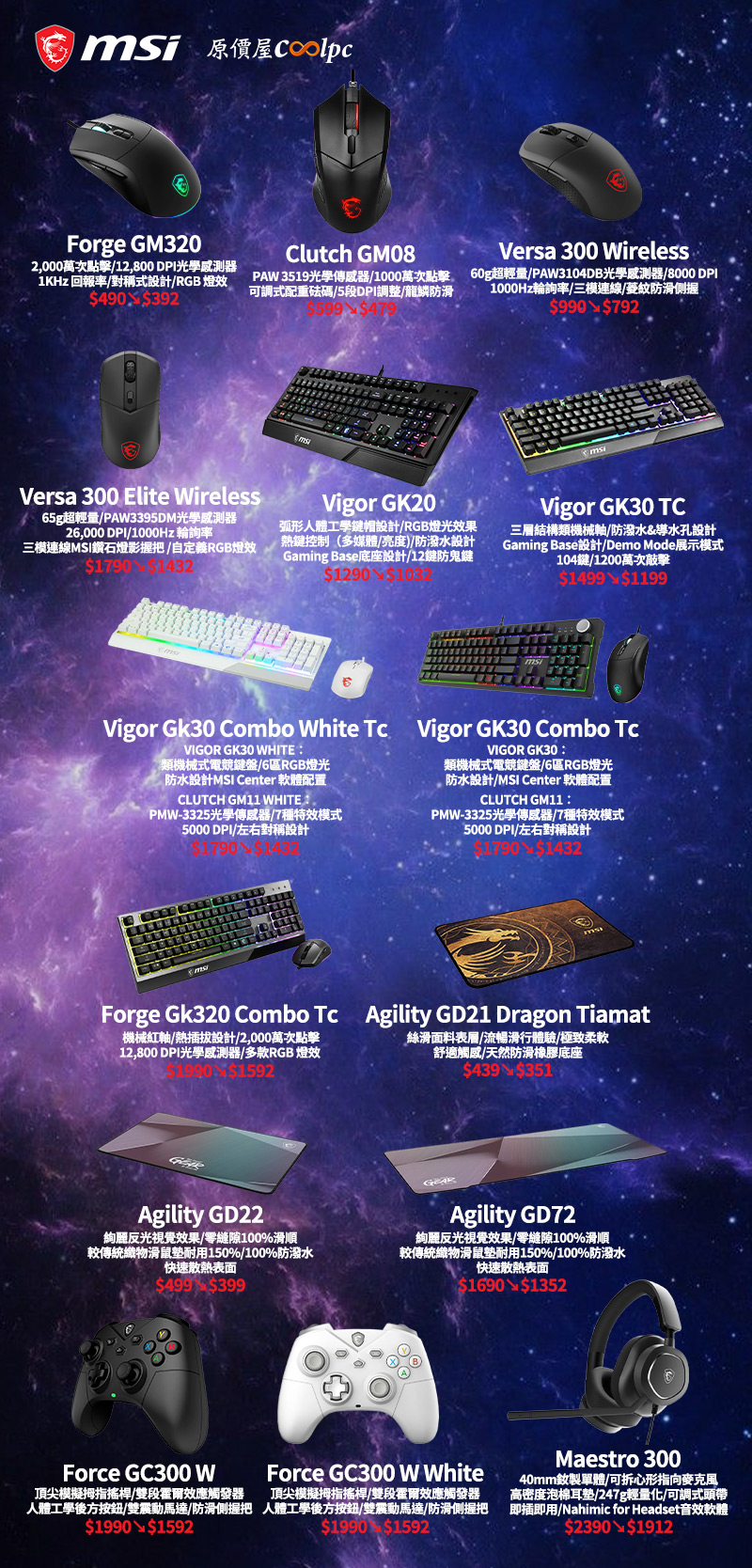 別再讓普通的鍵鼠週邊成為你勝利的絆腳石,現在就來挑選最適合你的微星電競周邊,讓你的電競體驗全面升級。選鍵盤有微星Vigor GK20、Vigor GK30 TC,擁有1200萬次敲擊壽命,12鍵/20鍵防鬼鍵,還有防潑水設計。滑鼠可以看看Clutch GM08,內建砝碼可以調整到適合自己的重量,喜歡輕一點的話就選Versa 300 Wireless,輕量化60g重量,還支援三模連線可無線使用,滑動都更加無拘無束。另外微星也提供Vigor GK30 Combo TC、Forge GK320 Combo TC鍵鼠組合,直接配好一套非常方便,後者的機械紅軸可以提供更佳的手感。滑鼠墊也有優惠,看是要面料絲滑又有大面微星龍魂樣式的Agility GD21 Dragon Tiamat,或是有反光視覺效果、耐用滑順又能100%防潑水的Agility GD22。如果習慣用手把玩遊戲的話,那就建議選微星Force GC300 W/Force GC300 W White,配備模擬指尖搖桿與人體工學後按鈕,操作上絕對自然舒適,還有雙震動馬達能夠強化遊戲體驗!最後玩遊戲肯定不能少了耳機,這回有內建40mm釹製單體的Maestro 300,247g輕量化與可調頭帶提供舒適配戴體驗,還支援Nahimic for headset音效軟體。現在這些通通8折優惠,有購入微星商品的朋友趕緊看看還有什麼要加購吧。