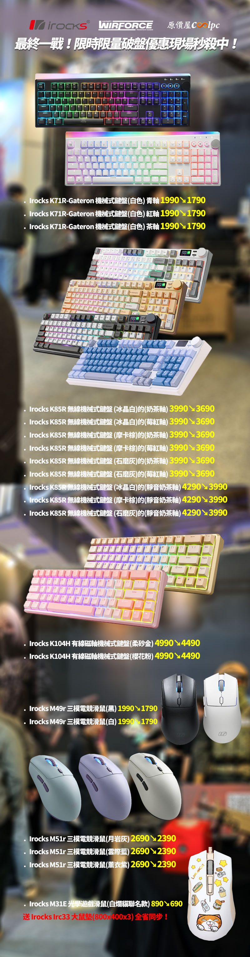 玩家們注意啦!全台最熱血的 LAN 趴踢 WirForce 2025 即將進入尾聲!今天 11/16 就是最終日了。如果你還沒衝進現場,那就真的要錯過年度最狂的「irocks 鍵滑神裝破盤價」了!原價屋攤位早已全面開戰,各路電競好手、鍵帽控、RGB 信仰粉都在現場親手體驗 iRocks 攤位裡擺放的更式產品,那手感「啪」一聲的瞬間快感。這次 iRocks 不只帶來經典熱銷款,還加碼在原價屋的現場攤位推出現場限定價!讓你入手夢幻鍵盤與電競滑鼠毫無負擔啊~現在在 WirForce 的「原價屋攤位」購買指定型號,就能享有破盤級折扣!超人氣款「K71R 機械式鍵盤(白色,青/紅/茶軸)」直降只要 $1790 起!還有質感系代表「K85 無線機械式鍵盤(冰晶白/摩卡棕/石磨灰色,奶茶/莓紅/靜音奶茶軸)」現場價最低 $3690!想要更高階觸感的粉絲,也別錯過沉穩細緻的「K104H 有線靜音機械鍵盤」,特價 $4490,典雅配色連非玩家都心動!不玩鍵盤也沒關係,現場同樣有滑鼠粉絲的最愛「iRocks M49 三模滑鼠(黑/白)款」,現省直接到 $2390!輕巧無線、延遲極低!而經典「M51R 電競滑鼠(月岩灰/雲際藍/薰衣紫)」現場價也只要 $1790!滑順流暢,RGB 點亮桌面氣勢滿點呢~
