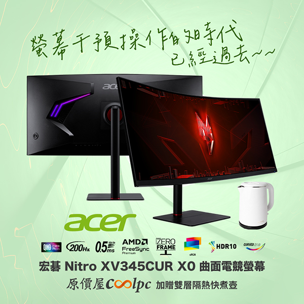 買了新電腦卻還是用舊螢幕跑 60Hz,那真是太委屈啦!不妨考慮宏碁 Nitro XV345CUR X0 電競螢幕,專為硬派電競玩家打造的 34 吋曲面神器!21:9 超寬 WQHD (3440×1440) 解析度,1000R VA 曲面,環抱視野沉浸感拉滿!0.5ms (GtG) 極速反應、200Hz 更新率、AMD FreeSync™ Premium 抗撕裂,對手一露頭,一發送回家!孟波說過:「冷靜的槍手,一顆子彈就夠了。」小編要說:好的槍手用宏碁 Nitro XV345CUR X0 電競螢幕就夠了!現在來原價屋購買再送價值 NT.890 的雙層隔熱快煮壺,限量活動送完為止,趕緊下單啦!
