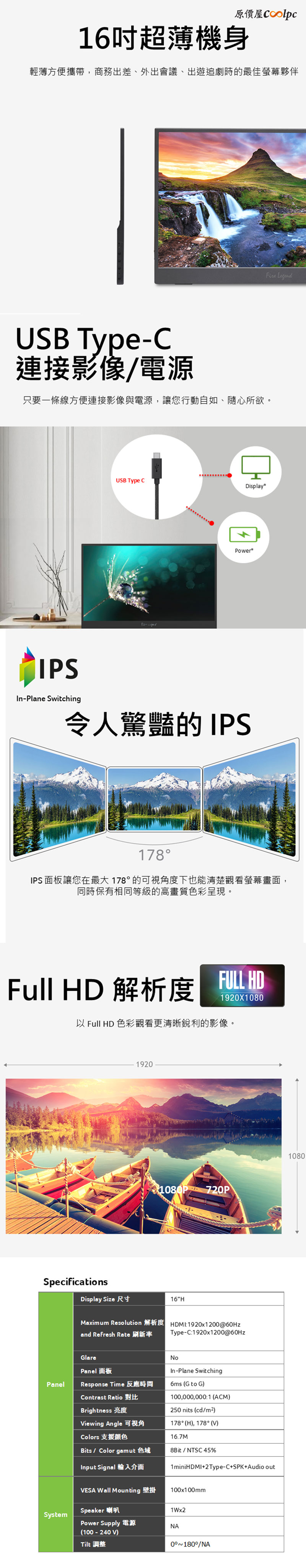 出門在外使用筆電覺得單螢幕不夠用、視窗切換到眼花撩亂嗎?ACER PM161W 可攜式螢幕幫你解決以上痛點,機身重量僅約 640g 的極致輕薄設計,與筆電一起塞進包包也毫無壓力,出門在外,你只需一條 Type-C 連接線就能同時完成供電與影像傳輸,告別繁瑣沉重的變壓器,無論在咖啡廳還是高鐵,短短的幾秒鐘就能架設好專屬雙螢幕工作站。這台 ACER PM161W 可攜式螢幕採用了 16 吋 IPS 廣視角面板與 16:10 的黃金比例,多工文書處理、比對 Excel 報表,都能提供更寬廣舒適的視覺體驗,螢幕還有 1 個 miniHDMI、2 個 Type-C、揚聲器,即使不是電腦要使用,手機裝置、平板有支援 DP Alt Mode 一樣可以把畫面輸出到可攜螢幕上。