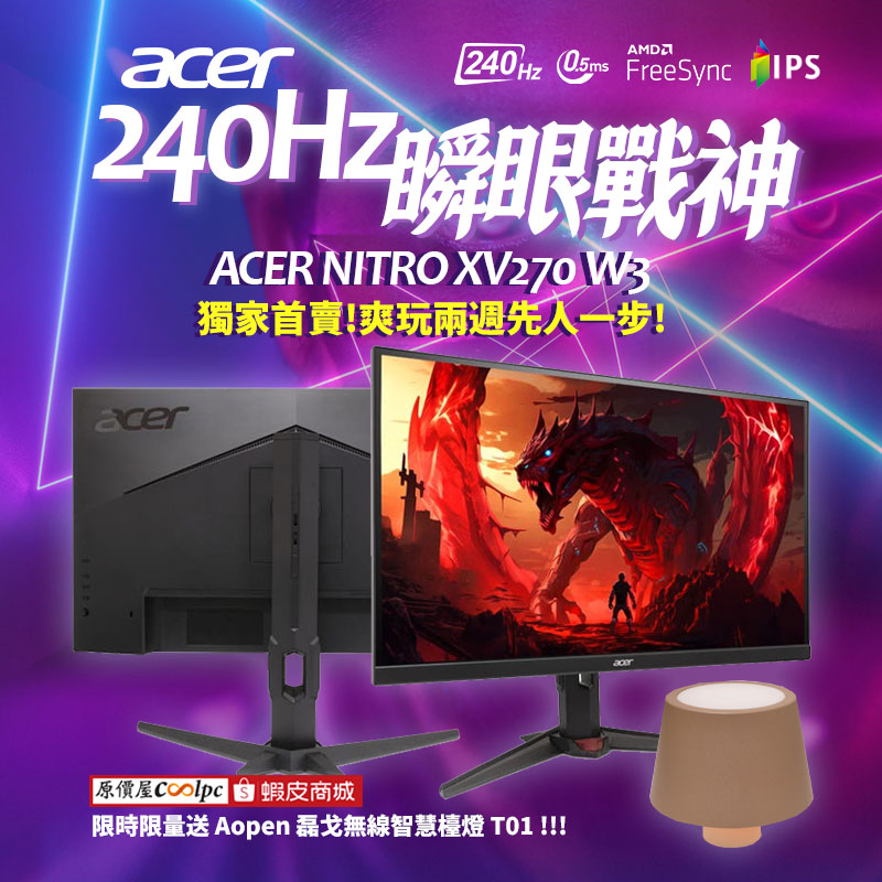 240Hz 瞬眼戰神獨家首賣!ACER NITRO XV270 W3 爽玩兩週先人一步!再送智慧檯燈!