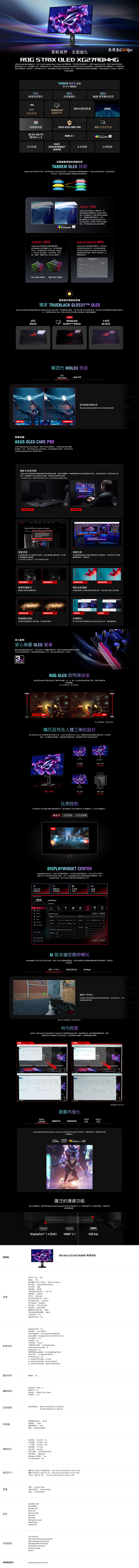 ROG STRIX XG27AQDMGR採用能夠減少環境反射的TrueBlack Glossy™ OLED面板,提供QHD(2560 x 1440)解析度、240Hz更新率、0.03ms反應時間(GTG)、99% DCI-P3色域、Clear Pixel Edge清晰文字、ELMB超低動態模糊、DisplayHDR TrueBlack 400認證。ROG STRIX XG27AQWMG也是TrueBlack Glossy™ OLED面板,而且多了亮度更高、色容量更大、使用壽命更長的Tandem OLED技術,提供QHD(2560 x 1440)解析度、280Hz更新率、0.03ms反應時間(GTG)、99.5% DCI-P3色域、ELMB超低動態模糊,DisplayHDR TrueBlack 500認證。兩台螢幕還有許多共通處,例如I/O都是配備2x HDMI 2.1、1x DP 1.4、2x USB3.2 Gen1 Type-A、1x耳機孔,搭載ROG OLED防閃爍技術,遊戲中有AI準心、AI Visual、AI動態暗場增益、Gameplus、Gamevisual等輔助功能,也支援DisplayWidget Center螢幕管理軟體,或是將畫面比例改成24.5″遊玩。當然也沒少了ASUS OLED CARE PRO技術保護面板,還包含最新的NEO接近感測器自動開關螢幕,再透過像素清理、螢幕位移、亮度調整等功能防止烙印,並搭配特製散熱器延長使用壽命,另外享有原廠3年保固。