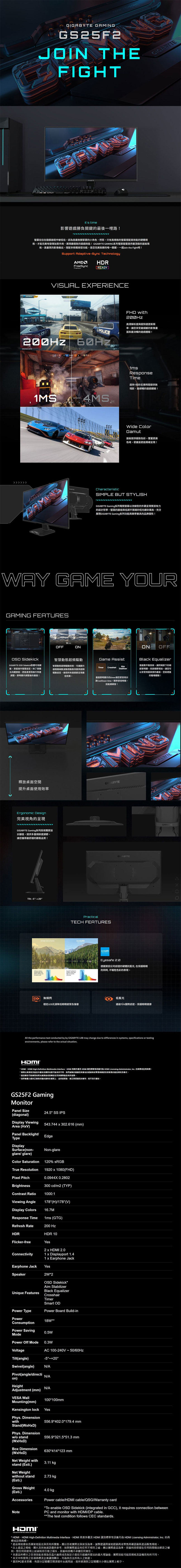.技嘉 GS25F2〈2H1P/IPS/200Hz/含喇叭/HDR10〉, $3690↘$2588