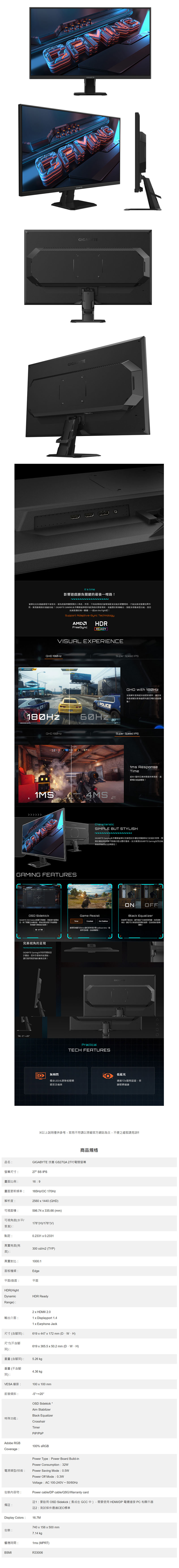 .技嘉 GS27QA〈2H1P/IPS/180Hz〉, $4990↘$3990