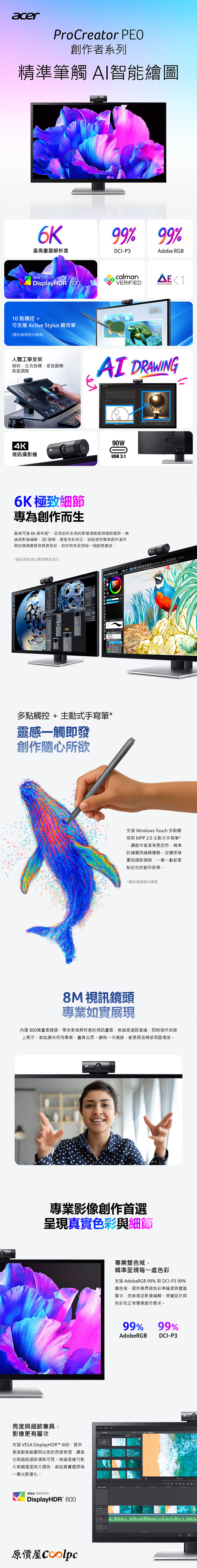 細節不夠細?校色不夠精準?宏碁 ProCreator PE320QXT 可觸控專業繪圖螢幕甚麼都滿足了!它採用 31.5 吋 IPS 面板並結合量子點 (Quantum Dot) 技術,色彩寬廣度達到 AdobeRGB 99% / DCI-P3 99% 色域覆蓋。搭載震撼的 6K(6016 x 3384)超高解析度,比標準 4K 更加細緻,讓您在處理高畫質圖層、大型印刷稿件時,無需頻繁縮放,就能掌握肉眼可見的所有細節。每一台 PE320QXT 都出廠通過嚴格的 Calman 專業色彩驗證,通過 VESA DisplayHDR™ 600 認證、Delta E < 1 超低色差,確保您在螢幕上看到的顏色與最終成品輸出能高度還原。在操作上,專業觸控功能結合 Windows Touch 相容的 MPP 2.0 磁性手寫筆,讓精修繪圖更直覺。I/O 介面提供 2 x HDMI 2.1、DP 1.4、支援 90W PD 供電的 Type-C 及 2 x USB 3.2 Type-A 介面,內建 8M 可調式網路攝影機及 5Wx2 喇叭。搭配 Acer Creator Hub 軟體管理色彩更輕鬆,最後使用支援傾斜、旋轉、升降及垂直翻轉的 ErgoStand 支架,舒適度滿分!
