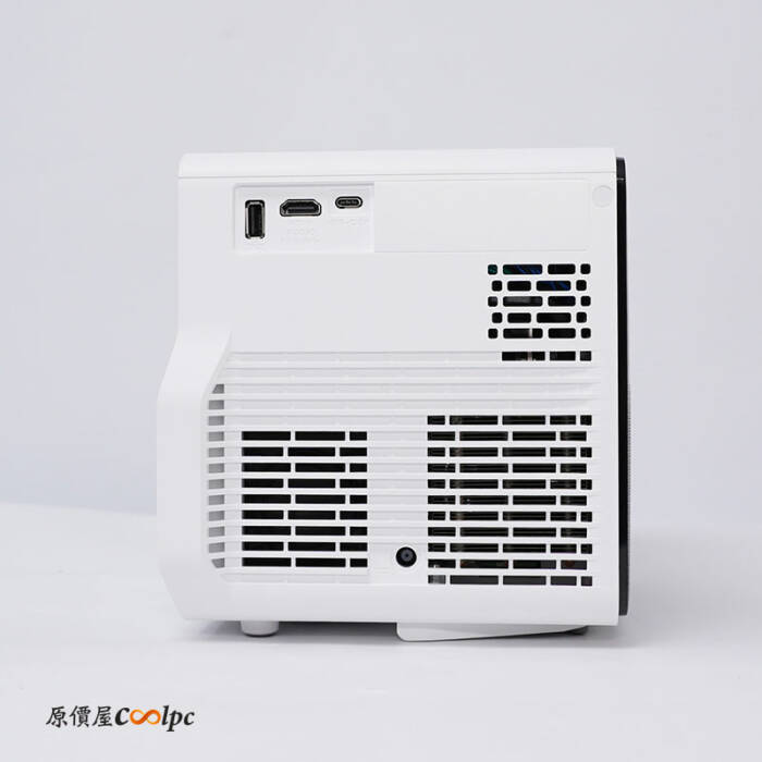 機器內部本身有一根 AndroidTV 電視棒,供電為 Micro USB,輸出介面為 Mimi HDMI。有了內建 AndroidTV 電視棒,在家追劇或去露營都可以帶出去觀賞,加上他又是短焦的優勢,不需要放太遠就可以投影。