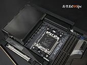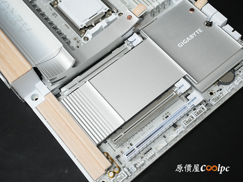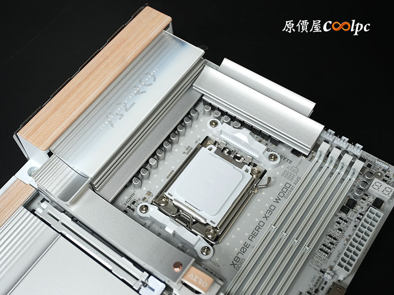 從這角度不僅可以更清楚觀察到 I/O 護罩的木紋飾板細節,還能看見圍繞著 AM5(LGA1718)插槽的大面積散熱裝甲,技嘉 X870E AERO X3D WOOD 採用 16+2+2 相數位供電設計,以及 8 層伺服器等級 PCB,強化信號完整性,Socket AM5 可支援 Ryzen 9000/8000/7000 處理器,即便搭載頂級的 Ryzen 9 9950X 或最新的 X3D 處理器,在高負載渲染或長時間運算下也能維持電壓的高度穩定。
