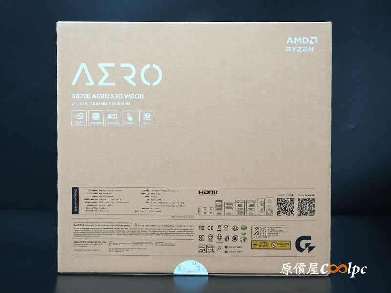 這張主機板的包裝第一眼就讓人感受到它的與眾不同。不同於 AORUS 系列那種充滿電競侵略性的深色設計,技嘉 X870E AERO X3D WOOD 採用了極簡的牛皮紙原色包裝,呼應了其「WOOD」的自然主題。專業玩家一眼就能看到重點:AMD Socket AM5、PCIe 5.0 以及 DDR5 的支援性。