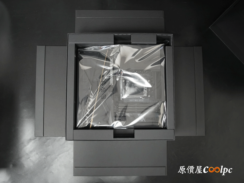 主機板盒打開後,內部共有三層,上層為技嘉 X870E AORUS XTREME X3D AI TOP 主機板,二、三層為主機板配件。