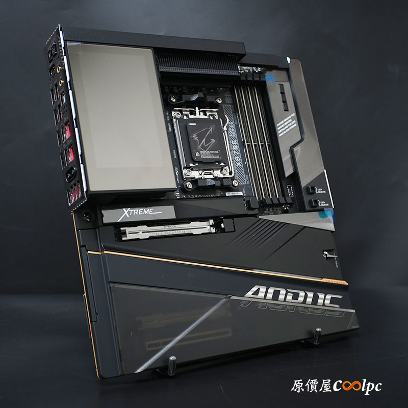 (點小圖放大)技嘉 X870E AORUS XTREME X3D AI TOP 主機板在外觀展現了頂級旗艦的黑金美學,全板由大面積的深黑色金屬散熱裝甲覆蓋,並搭載醒目的 5 吋 Edge View 全彩 LCD 螢幕,能即時監控系統參數或顯示自定義動畫。主板提供 24+2+2 相數位供電與雙 8-pin UD 電源連接器,完美駕馭 AMD Ryzen 9000 全系列或未來的 X3D 系列處理器。記憶體提供 4 x DIMM DDR5 雙通道插槽(Memory UD Slot D5 強化),最高支援 DDR5 9000+ MT/s(OC);2 x SATA 6Gb/s 插座並支援 RAID 0 / 1;擁有 2 組具備 PCIe UD Slot X 強化的 PCIe 5.0 x16 插槽(支援 x16 或 x8/x8 模式)、1 組裝甲強化 PCIe 4.0 x16(x4) 插槽,PCIe 5.0 x16 插槽具備 PCIe EZ-Latch Plus Duo 快拆設計,一鍵釋放顯卡卡扣。共提供 5 組 M.2 插槽(最高支援 2 x PCIe 5.0 x4)與 M.2 EZ-Latch Click 與 M.2 EZ-Latch Plus 免螺絲快拆設計,搭配巨型 M.2 Thermal Guard Xtreme 散熱裝甲,徹底發揮 PCIe 5.0 儲存效能。