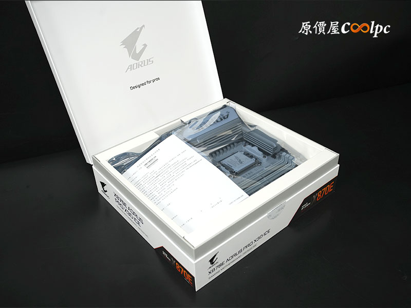 掀開外盒後,可以看見上蓋內側印有簡約的 AORUS 鷹神標誌與「Designed for pros」字樣,強調為專業人士所設計!上層擺放主機板,下層擺放配件。