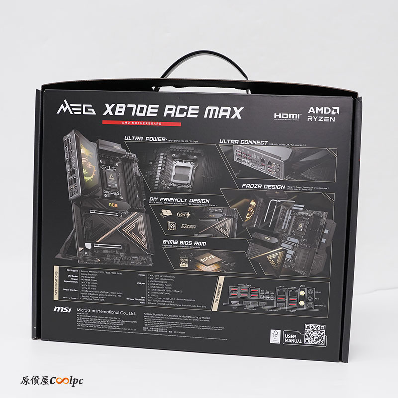 微星 MSI MEG X870E ACE MAX 主機板外盒很有質感,經典傳奇的英文配上主機板示意圖,具備 40G Ultra 傳輸介面、10GbE 有線與 Wi-Fi 7 無線網路介面,外盒背面則是特色介紹,有旗艦級 VRM 設計、完整傳輸解決方案、EZ DIY 快拆設計、優異散熱設計。打開內襯有卓越匠心之作字眼。