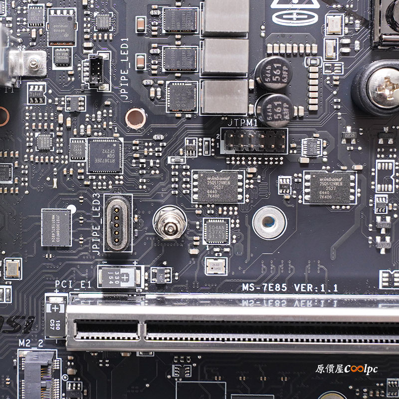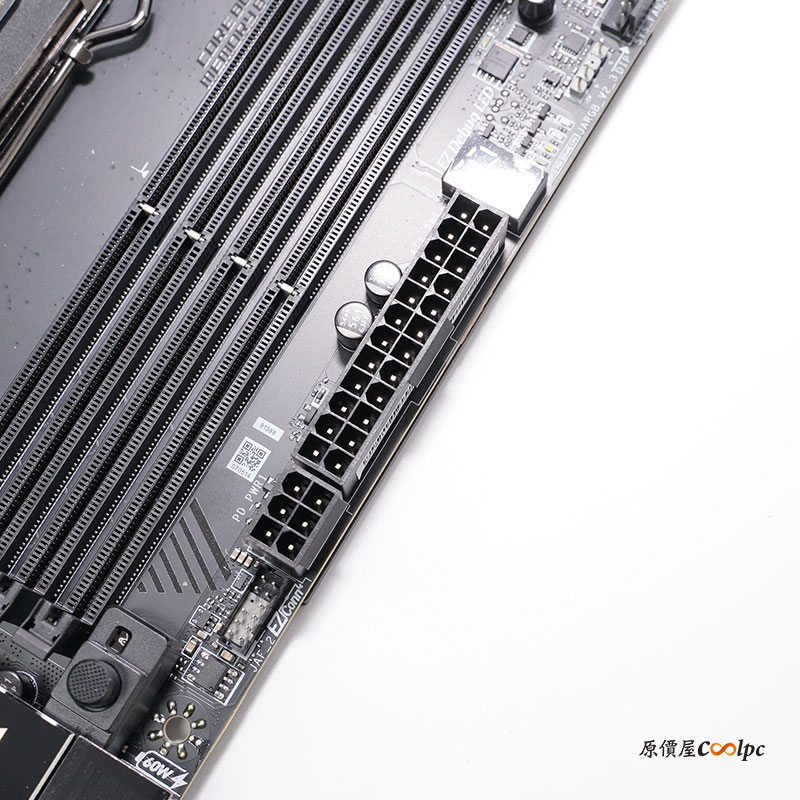 旁邊主機板的 24 Pin也是實心針腳設計,下面 6 Pin 是給前置 USB Port 提供 27W 供電,透過自家 MSI Center 軟體還能即時監控 USB 的輸出功率、電壓和電流。