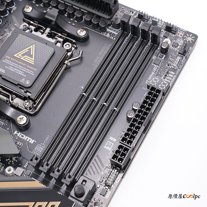 記憶體提供四個 DDR5 插槽,支援雙通道技術,最大可安裝 256GB 容量。插槽旁邊還有數位除錯顯示器和 LED 指示燈;6 Pin 下方 EZ Conn 插槽,可以讓你接MSI EZ 系列風扇(7 pin)或MSI 一體式水冷(11 pin),沒有限定產品也沒關係,有附上 1 對3 EZ Conn 線材,可連接ARGB 燈、系統風扇和 USB 裝置。