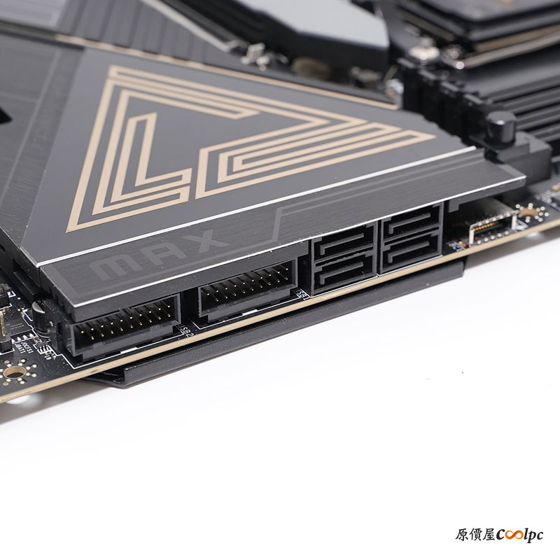 側面 I/O 最前面的是機殼前置 USB Type-C (20Gbps)介面,4 個 SATA 6Gb/s 插孔,支援 RAID 1/10 磁碟陣列技術;最後面兩個則是機殼前置 USB 5Gbps 介面。