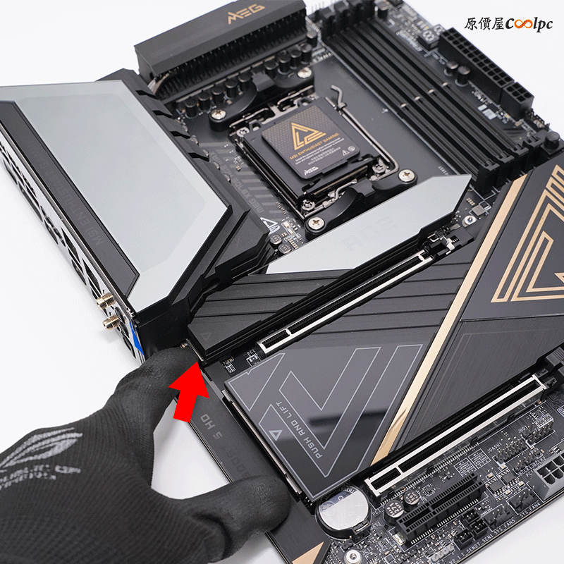 散熱片與底下皆有雙層導熱膠,紅色框框的 SLOT 為 PCIe 5.0 通道,藍色與背後皆為 PCIe 4.0,使用 Ryzen 8000 Series 處理器通通都會變成 PCIe 4.0。