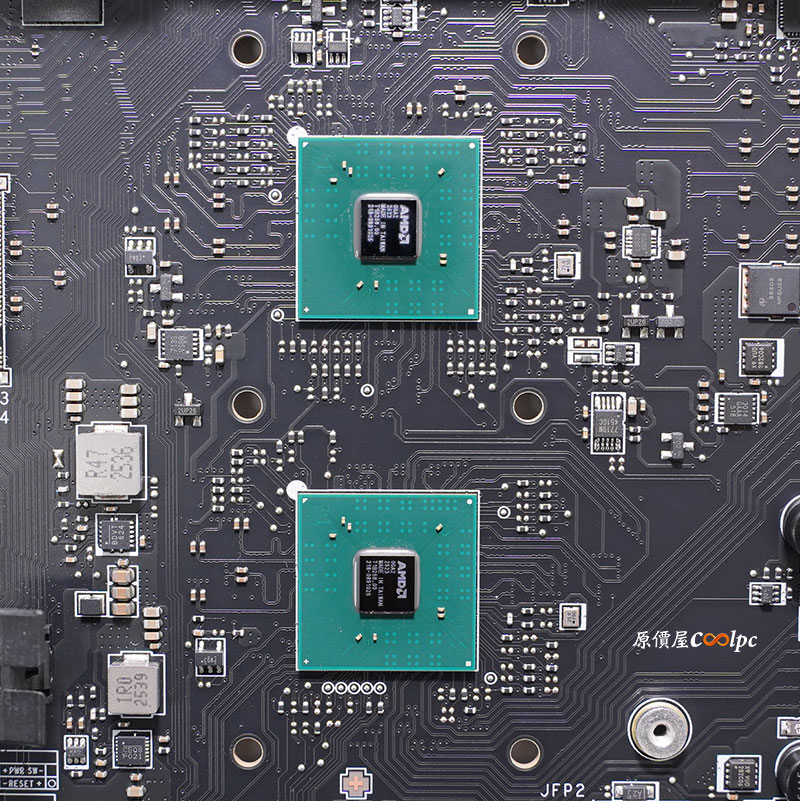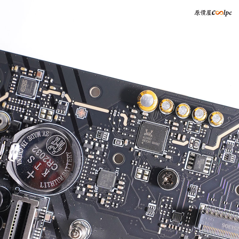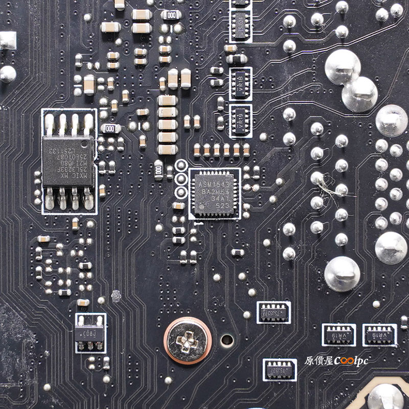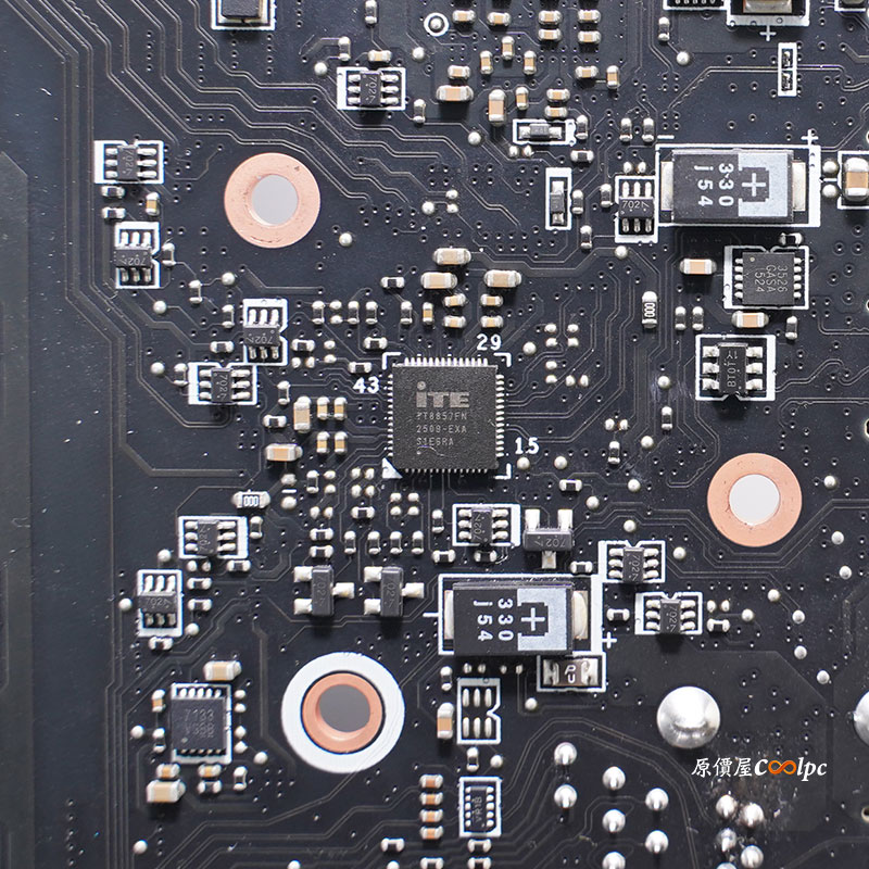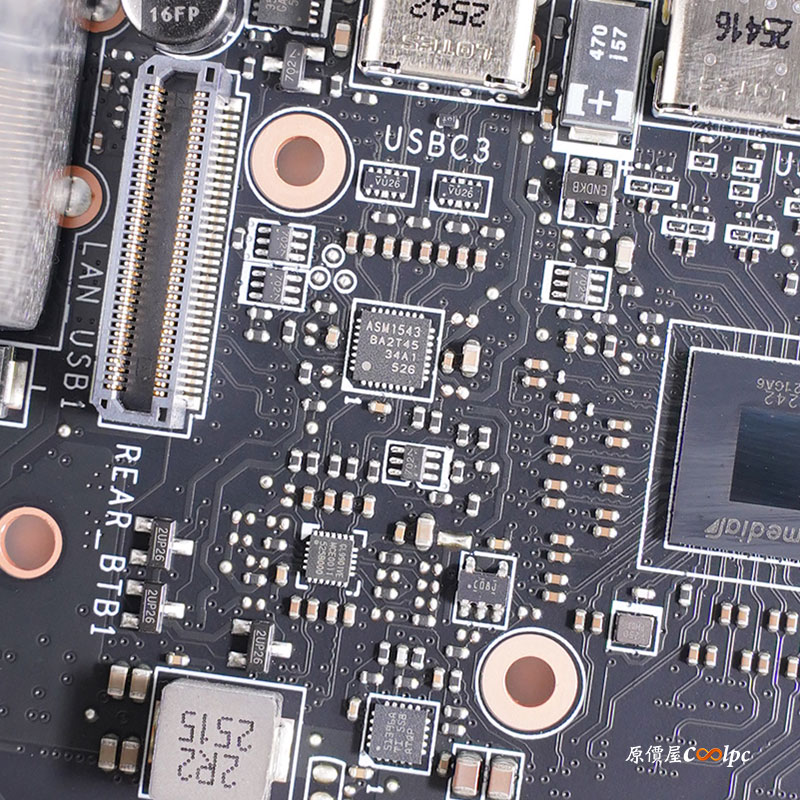 (點圖放大) 緊接著來看看主機板內部用料囉!拆開波浪式鰭片與直觸式交叉熱導管 散熱模組,後 I/O USB 介面採用模組化設計,主機板採 18(110A)+2+1 數位供電相數設計,電供主控晶片為 Renesas Electronics RAA229620,MOSFET 為 R2209004 SPS 和一顆 AOZ5516QI 與 RT3672EE 主控,HDMI 中繼晶片 Realtek RTD2151,USB4 晶片 ASM4242,USB4 提供 PD 充電晶片 IT8857FN,Type-C 晶片正反兩顆 ASM1543,10GbE 有線網路晶片 Marvell AQC113,5GbE 有線網路晶片 Realtek RTL8126,PCIe 5.0 訊號中繼晶片 Phison PS7101,音效晶片 Realtek ALC4082 Codec 和 ES9219Q DAC,雙 AMD X870E 晶片,環控晶片 NCT6687D,WI-Fi 7 + 藍芽 5.3 傳輸晶片為 MTK MT 7927。
