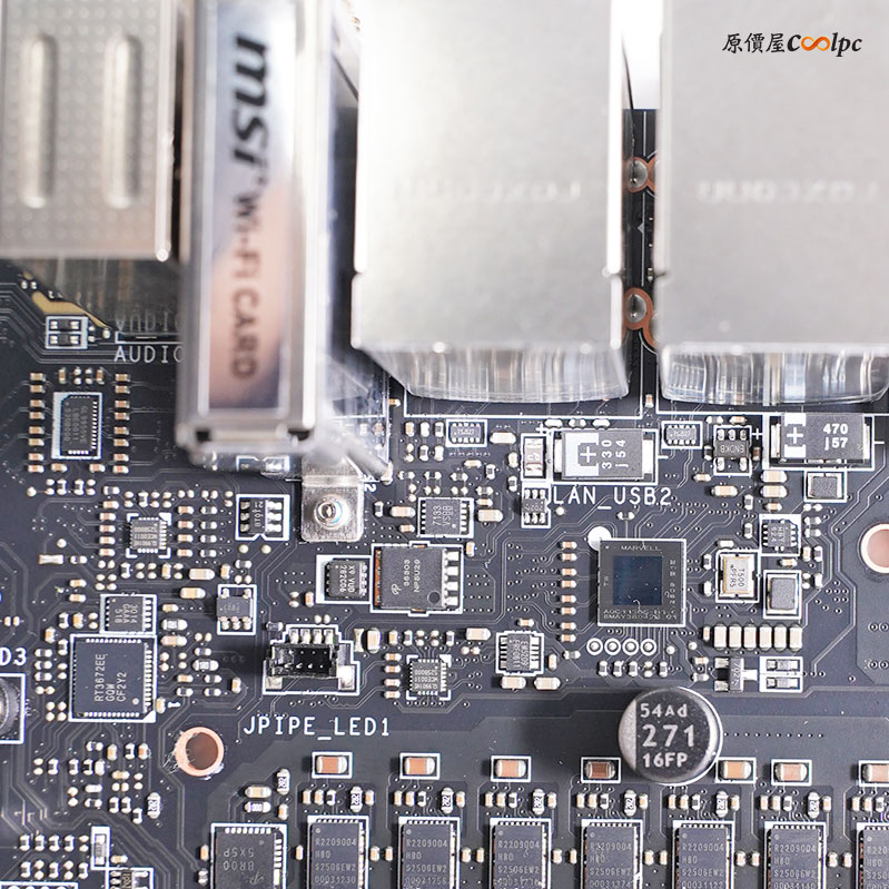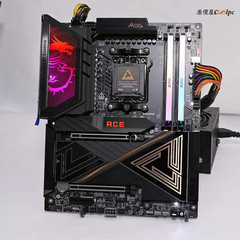 過電的時候後方 I/O 上的螢幕會有微星龍紋的 LOGO,具備 ARGB 的效果,連動 主要 M.2 散熱裝甲上 ACE 燈效。