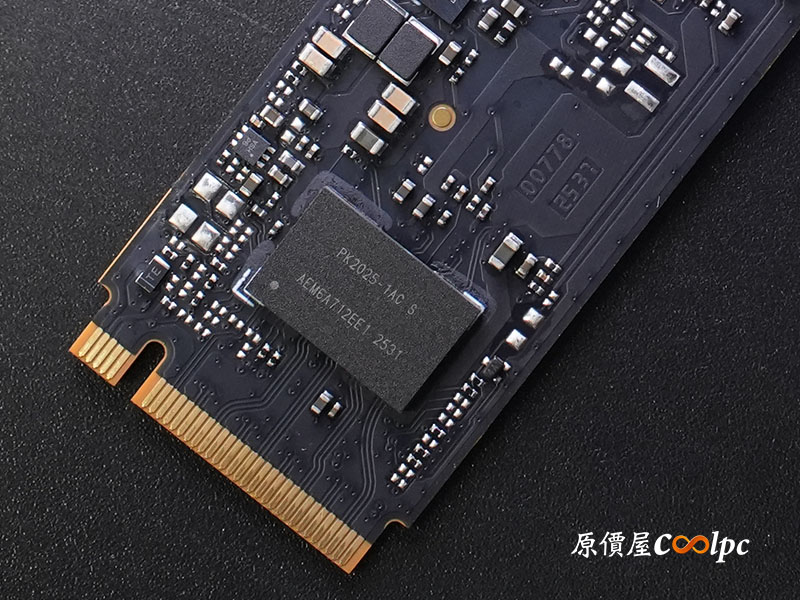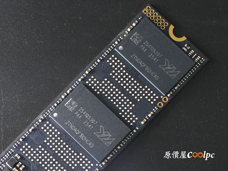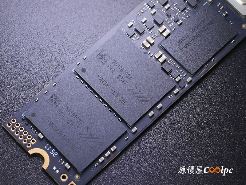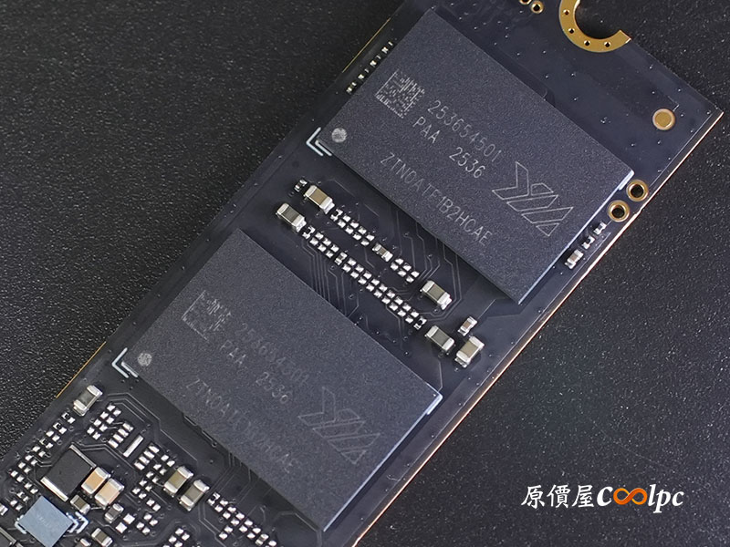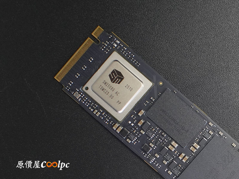 主控晶片採用慧榮科技 Silicon Motion SM2508,也就是台積電(TSMC) 6nm 製程打造的頂級控制器,擁有極佳的功耗比與性能表現,支援 PCIe Gen5 x4 與 NVMe 2.0 協定。單面 2 顆編號為 YMNOATF1B3LCBE 的長江存儲原廠 3D NAND TLC 顆粒,搭載最新 Xtacking® 4.0 架構,在儲存密度與傳輸頻寬上皆屬頂尖。還有獨立 DRAM 快取記憶體(編號 BWCC2X32N2A-16G-X),提供高負載讀寫時更穩定。2TB 版本連續讀寫速度最高達 14,000 / 12,500 MB/s,具備 1,200 TBW 耐用度,無論是 AAA 遊戲大作載入還是 8K 影像剪輯,都能提供最極致的順暢體驗。