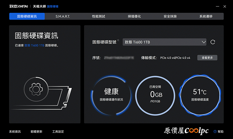 固態硬碟資訊與健康監控:進入首頁即可快速判讀 SSD 的詳細型號、韌體版本、傳輸模式以及即時溫度。透過動態環狀圖表,玩家能一眼確認硬碟健康度與已用空間量,確保資料存取安全無虞。