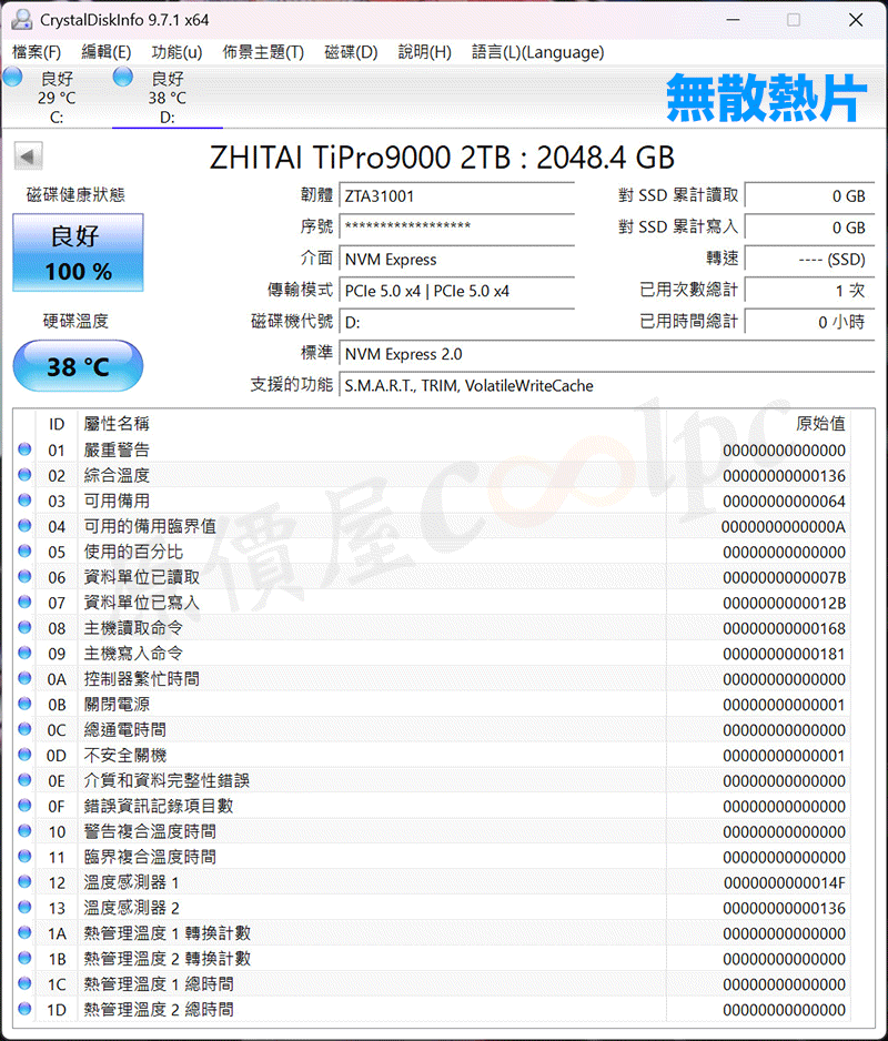 首先測試無輔助散熱的溫度表現,以 CrystalDiskMark 進行性能測試,在 CrystalDiskInfo 資訊得知待機溫度為 38°C,高效能運作溫度最高達到 71°C。