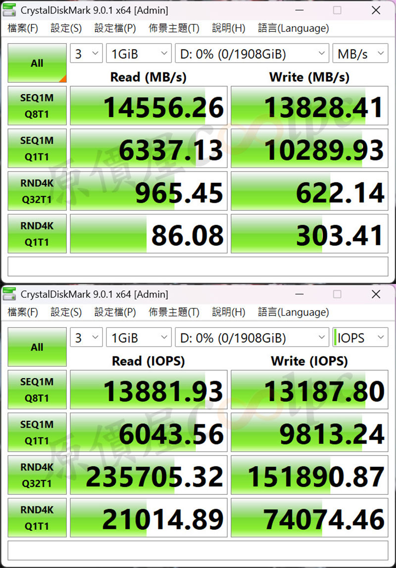 CrystalDiskMark 效能測試表現,連續讀寫效能達到 14,556 MB/s 和 13,828 MB/s,4K 部分達 86 MB/s 和 303 MB/s。(實際測試可能因環境略有差異)