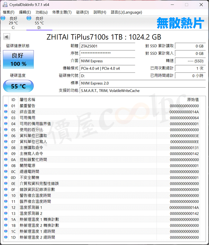 測試致態 ZhiTai TiPlus7100s 1TB SSD 無輔助散熱的溫度表現,以 CrystalDiskMark 進行性能測試,在 CrystalDiskInfo 資訊得知待機溫度為 55°C,高效能運作溫度最高達到 72°C。