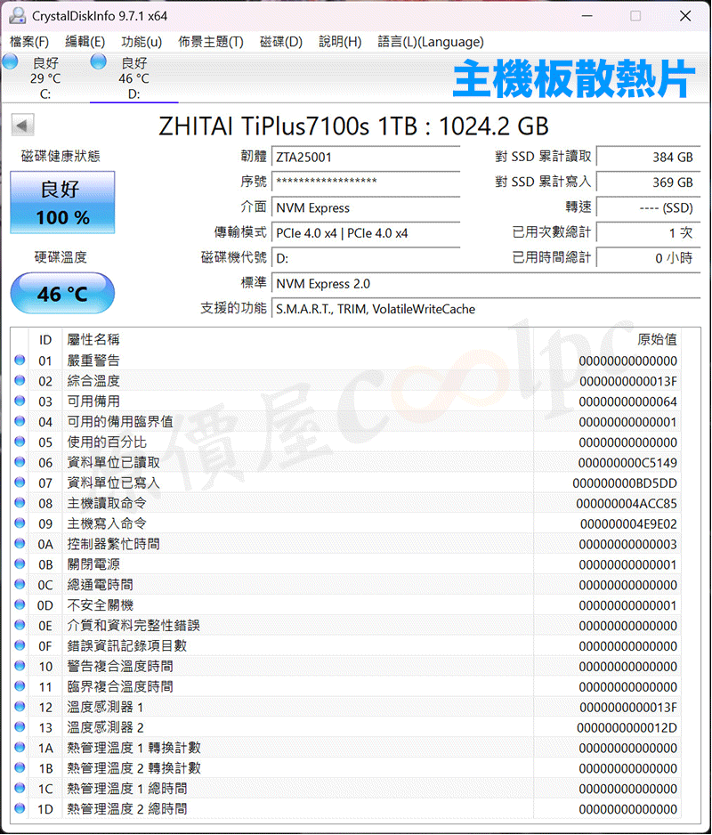 致態ZhiTai TiPlus7100s 1TB/Gen4/PCIe 4.0/讀7400/寫6900/TLC【五年保】, $4999