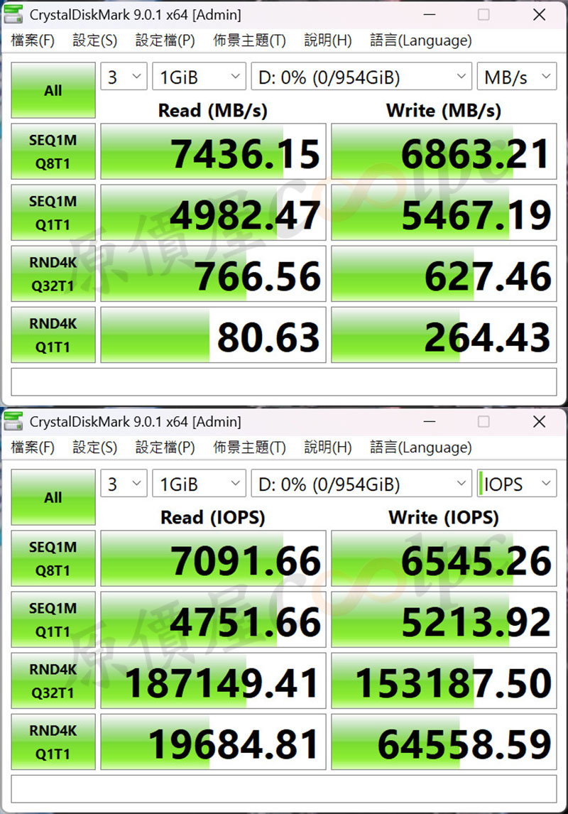 CrystalDiskMark 效能測試表現,連續讀寫效能達到 7,436 MB/s 和 6,863 MB/s,4K 部分達 80 MB/s 和 264 MB/s。(實際測試可能因環境略有差異)