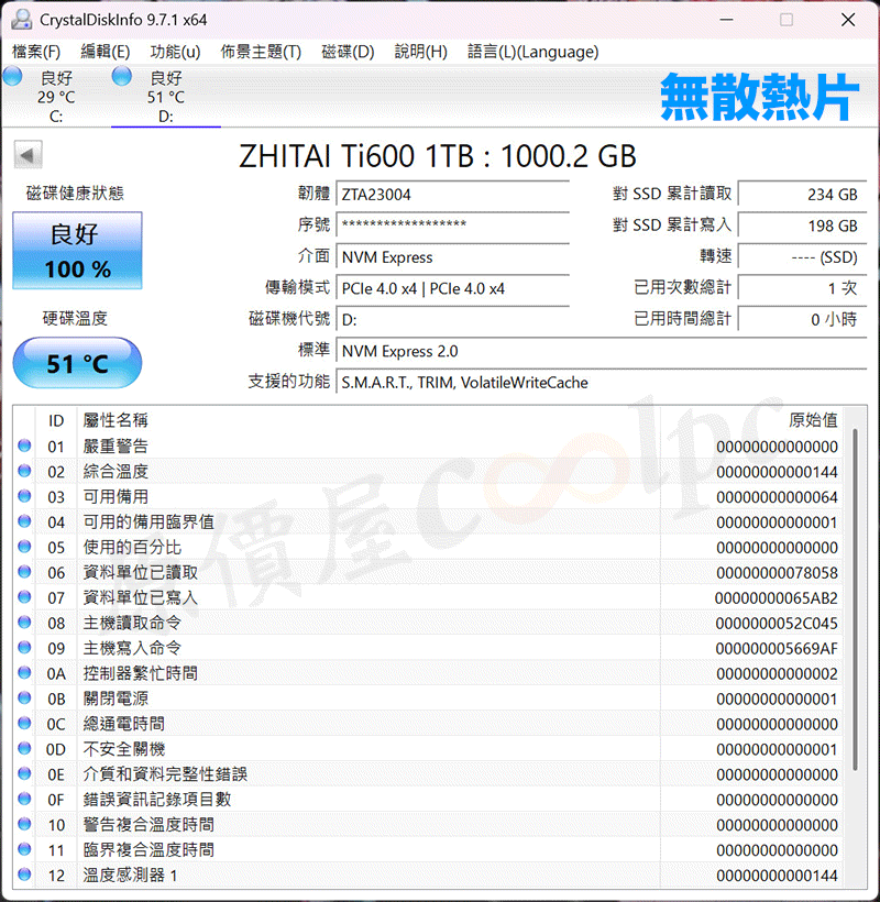 測試致態 ZhiTai Ti600 1TB SSD 無輔助散熱的溫度表現,以 CrystalDiskMark 進行性能測試,在 CrystalDiskInfo 資訊得知待機溫度為 51°C,高效能運作溫度最高達到 70°C。