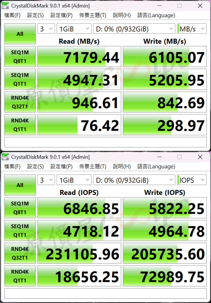 CrystalDiskMark 效能測試表現,連續讀寫效能達到 7,179 MB/s 和 6,105 MB/s,4K 部分達 76 MB/s 和 298 MB/s。(實際測試可能因環境略有差異)