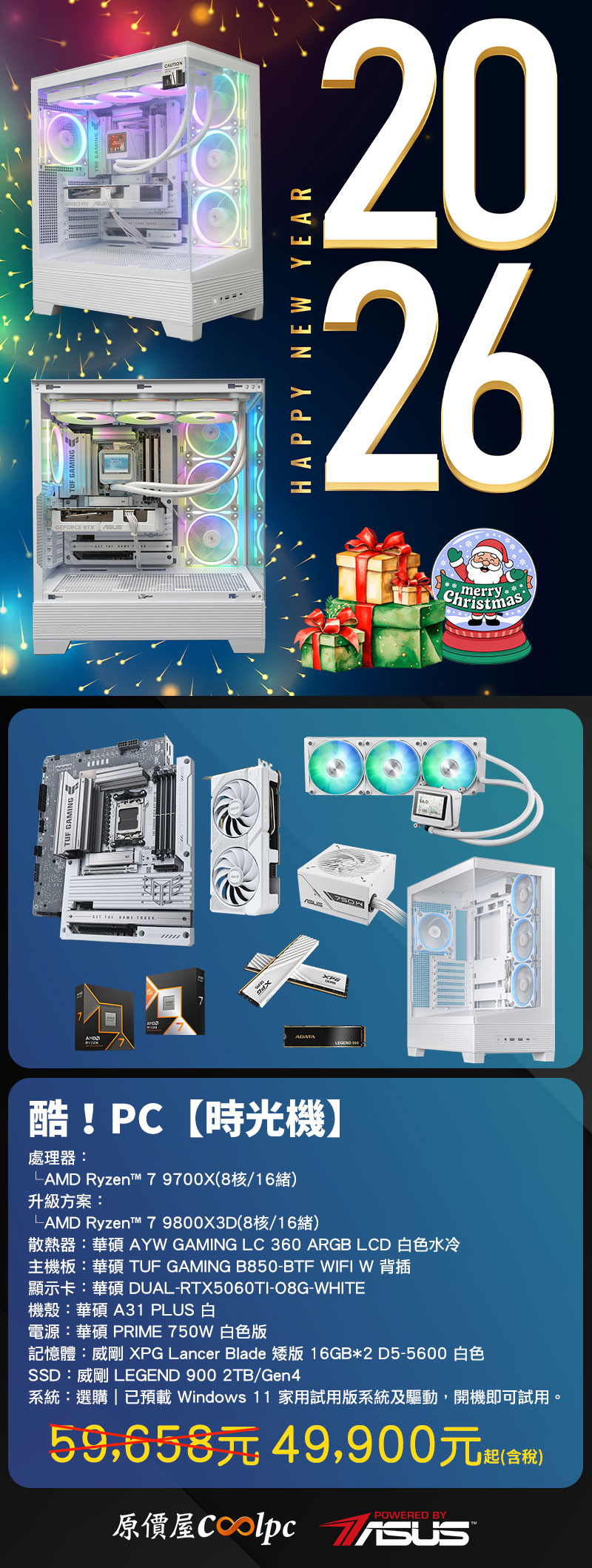 聖誕快樂!Merry Christmas!聖誕鐘聲響起,跨年也在倒數中。回首這一年,辛苦了…該告別 2025 的延遲,原價屋帶您直接跳躍到 2026 的極致流暢!搭配華碩 BTF 全背插美學最對味,原價屋在此獻上最誠摯的歲末祝福,推出酷!PC【時光機】。