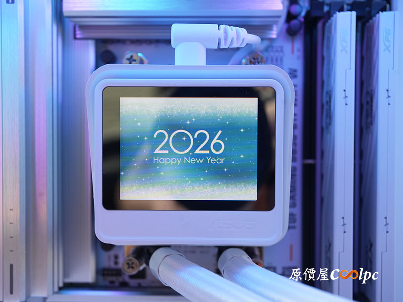 * 華碩 AYW GAMING LC 360 ARGB LCD 白色水冷:超吸睛 2.4 吋 IPS 液晶螢幕,想放聖誕老公公還是跨年倒數圖案隨你傳!支援顯示自訂動畫 GIF、即時監控 CPU 時脈、電壓、溫度與風扇轉速等系統資訊。360mm 大冷排,壓制高階 CPU 輕而易舉,顏值與實力並存。