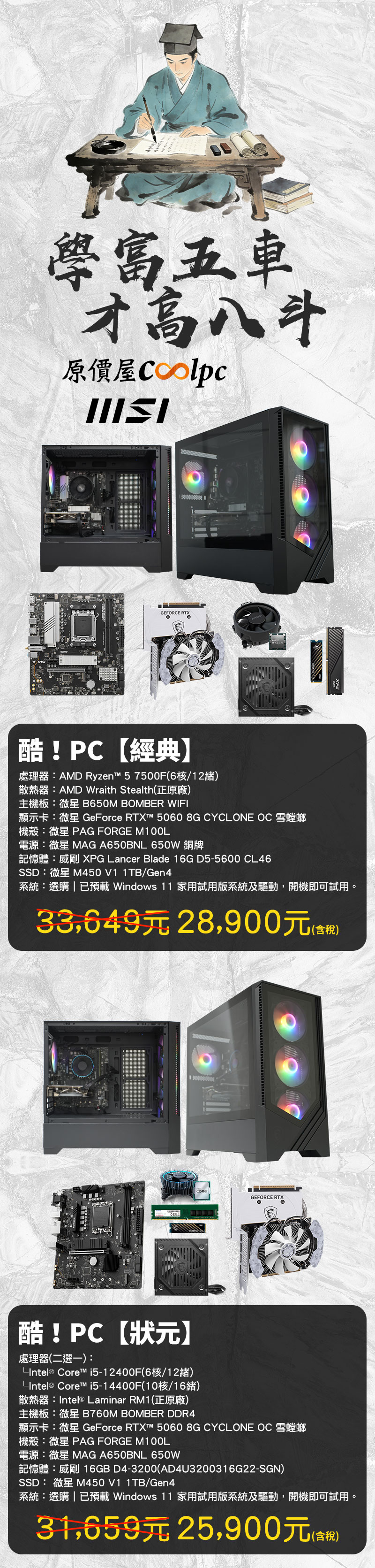 繼酷!PC【狀元】主機以萬人之上之姿橫掃戰場後,熱銷的盛況反映出各位對極致 C/P 值的渴望,原價屋決定延續這股不敗氣勢,讓酷!PC【狀元】主機強勢歸位,並同步推出新世代悍將酷!PC【經典】主機聯手出擊!如果說【狀元】是運籌帷幄、實力奪魁的統帥,那麼【經典】就是學富五車、更顯貴氣的經典文魁。Intel 與 AMD 兩大陣容全面補齊,無論您是要在遊戲戰場橫掃千軍,還是追求 AI 運算的黑科技加速,這裡都有您的專屬配備,讓您在電競與創作的江湖中,始終立於不敗之地!