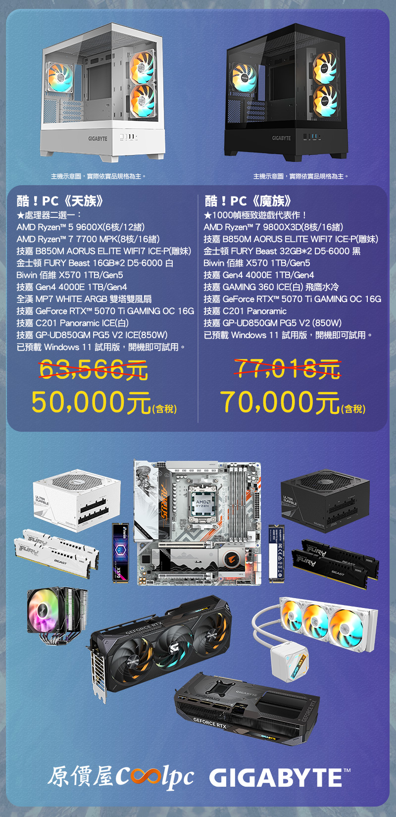酷!PC《天族》《魔族》兩款主架構全搭技嘉系列,從技嘉 B850M AORUS ELITE WIFI7 ICE-P 雕妹主機板開頭:二次元的突破性設計理念,搭配 12+2+2 相供電、VRM Thermal Armor 散熱 + PCIe 5.0 資源,穩如泰山、快如閃電!技嘉 GeForce RTX™ 5070 Ti GAMING OC 16G 顯示卡:神一般的 DLSS 4 AI 超解析度,配上出色的風之力散熱系統,結合伺服器級導熱凝膠、Hawk 風扇、複合式銅質導熱管 + 大面積導熱板,不論 AI 運算或遊戲表現皆不容小覷!技嘉 GP-UD850GM PG5 V2 850W 電源:全模組 ATX3.1 穩定輸出 + 10 年保固長長久久!技嘉 C201 Panoramic 機殼:內建 ARGB 三風扇 + 270°全景玻璃,主打的就是一個散熱快,視野又好!硬碟選用美國 TIME 雜誌評選肯定的佰維 1TB Gen5 SSD,再加一顆技嘉 1TB Gen4 SSD 輔助,輕鬆配置遊戲空間。Gen5 高效能強調 14000Mbps 讀取,隨便都是 Gen 4 兩倍以上的讀取速度,延遲更低,過圖更快,反映就是快人一步唯快不破!而酷!PC《天族》全機為白色主視覺,主打 AMD CPU 二選一(R5 9600X 或 R7 7700 MPK),金士頓 FURY Beast 16GBx2 D5-6000(白) 記憶體、全漢 MP7 WHITE ARGB 散熱器(6 導管 + FDB 雙風扇抑制溫度);酷!PC《魔族》為黑色主視覺,直接使用遊戲霸主 AMD R7 9800X3D – 頂!金士頓 FURY Beast 32GBx2 D5-6000(黑) – 頂!技嘉 GAMING 360 ICE 水冷散熱器 – 頂!