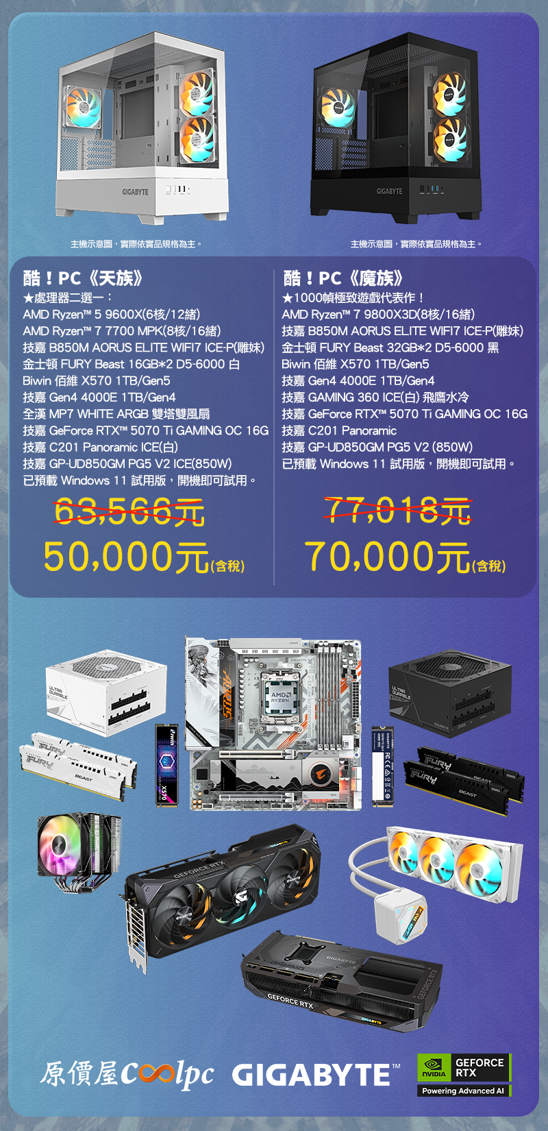 酷!PC《天族》《魔族》兩款主架構全搭技嘉系列,從技嘉 B850M AORUS ELITE WIFI7 ICE-P 雕妹主機板開頭:二次元的突破性設計理念,搭配 12+2+2 相供電、VRM Thermal Armor 散熱 + PCIe 5.0 資源,穩如泰山、快如閃電!技嘉 GeForce RTX™ 5070 Ti GAMING OC 16G 顯示卡:神一般的 DLSS 4 AI 超解析度,配上出色的風之力散熱系統,結合伺服器級導熱凝膠、Hawk 風扇、複合式銅質導熱管 + 大面積導熱板,不論 AI 運算或遊戲表現皆不容小覷!技嘉 GP-UD850GM PG5 V2 850W 電源:全模組 ATX3.1 穩定輸出 + 10 年保固長長久久!技嘉 C201 Panoramic 機殼:內建 ARGB 三風扇 + 270°全景玻璃,主打的就是一個散熱快,視野又好!硬碟選用美國 TIME 雜誌評選肯定的佰維 1TB Gen5 SSD,再加一顆技嘉 1TB Gen4 SSD 輔助,輕鬆配置遊戲空間。Gen5 高效能強調 14000Mbps 讀取,隨便都是 Gen 4 兩倍以上的讀取速度,延遲更低,過圖更快,反映就是快人一步唯快不破!而酷!PC《天族》全機為白色主視覺,主打 AMD CPU 二選一(R5 9600X 或 R7 7700 MPK),金士頓 FURY Beast 16GBx2 D5-6000(白) 記憶體、全漢 MP7 WHITE ARGB 散熱器(6 導管 + FDB 雙風扇抑制溫度);酷!PC《魔族》為黑色主視覺,直接使用遊戲霸主 AMD R7 9800X3D – 頂!金士頓 FURY Beast 32GBx2 D5-6000(黑) – 頂!技嘉 GAMING 360 ICE 水冷散熱器 – 頂!