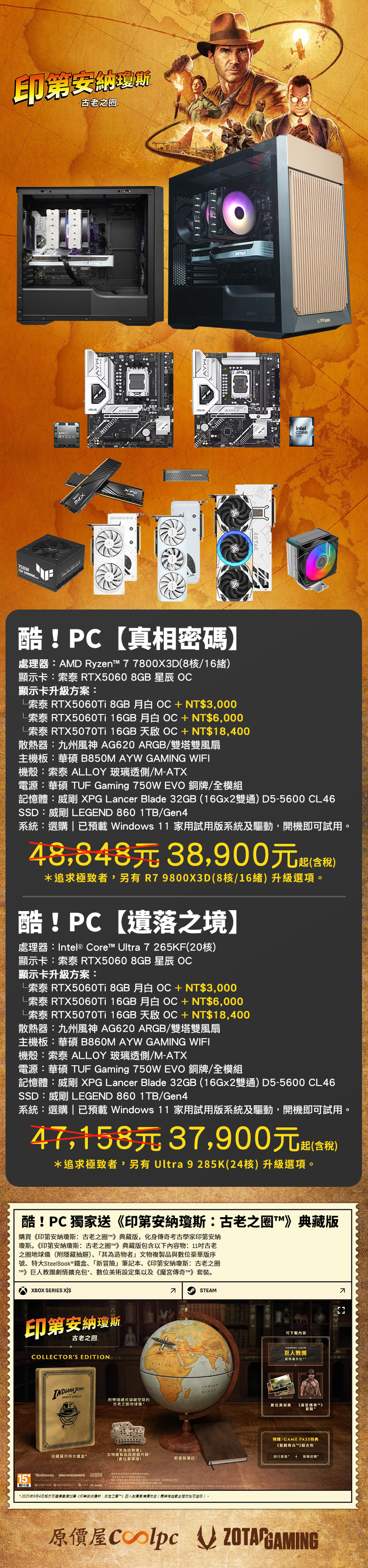 一頂牛仔帽、一根長鞭,還有足以應付最複雜機關的頂級效能!原價屋賣了無數款套裝主機,依然秉持「將寶藏歸還玩家」的精神,用實際行動讓玩家組出最高 C/P 值!帶走最具話題性的限量贈品!無論是追求 AMD 遊戲之神 Ryzen 7 7800X3D/9800X3D 的極致穩定,還是嚮往 Intel® Core™ Ultra 系列 AI 運算新紀元的效能巔峰,選擇酷!PC【真相密碼】【遺落之境】限量主機,預算上的機關我們替您破解,近萬元的漲幅價差直接原地封印!由於預算上有嚴格總量管控,這波合計僅能準備 300 套,售完為止!僅開放原價屋線上估價系統下單,主機統一由五股專業產線組裝測試,您可以選擇宅配直達或至全台門市親自點交,感受業界唯一、安心交機的專業服務!