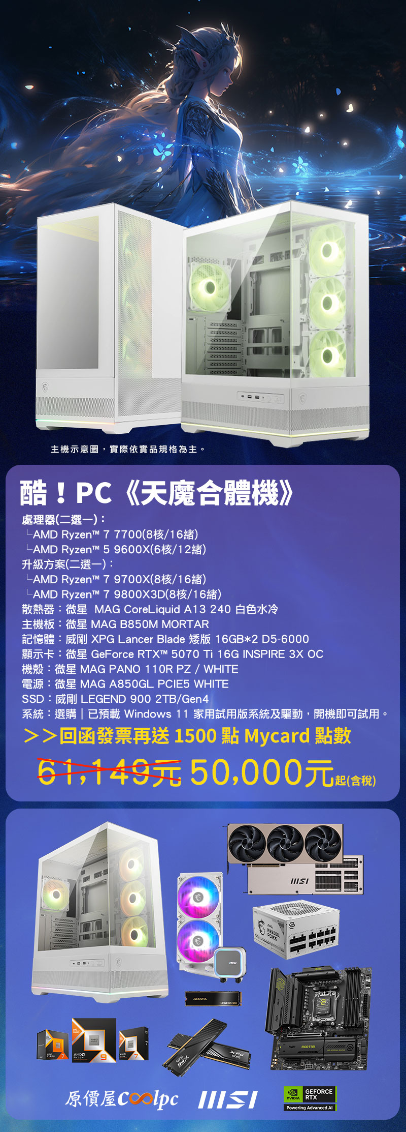 售價現折萬元以上,回函再送 1500 點 Mycard 點數!上回酷!PC《天族/魔族》搶購一空,AION 2 遊戲的魅力果然不容小覷!這次別再錯過微星 x 原價屋酷!PC《天魔合體機》,內含 Ryzen 7700/9600X/9700X/9800X3D、RTX 5070 Ti 顯示卡,搭配用料扎實且擴充豐富的微星 MAG B850M MORTAR 主機板,再送 Wi-Fi 6E + 藍牙功能無線網卡,強迫你一次到位