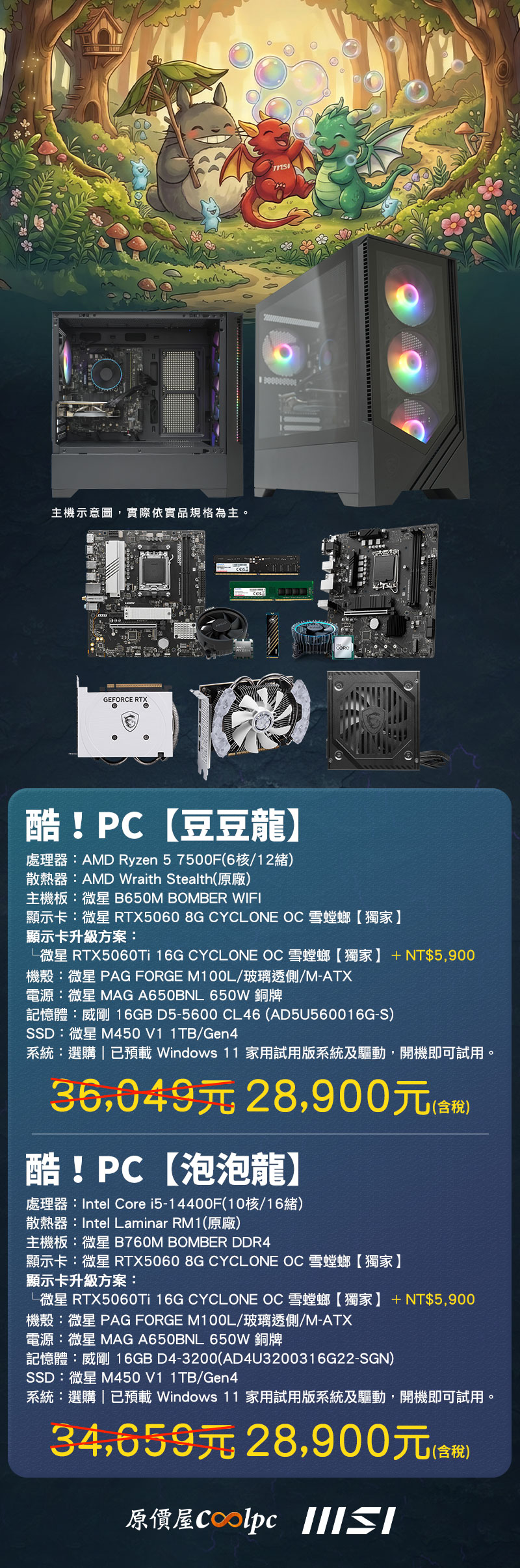 這陣子光看到記憶體與 SSD 的價格就縮了,但現實是…遊戲要玩、案子要做,最終電腦還是得組。原價屋這次直接找上 NVIDIA、AMD、Intel、MSI 各大廠談個痛快!我們決定竭盡所能為各位玩家守住這塊最後的性價比淨土,正式推出酷!PC【豆豆龍】與【泡泡龍】特仕主機。整套最高折價超過 NT$7,000!同步開啟 +NT$5,900 升級 RTX 5060 Ti 16G 的專案,翻倍的 GPU 記憶體,針對有 AI 繪圖、LLM 模型與 3D 渲染,甚至單純遊戲需求的專業玩家皆可受惠!