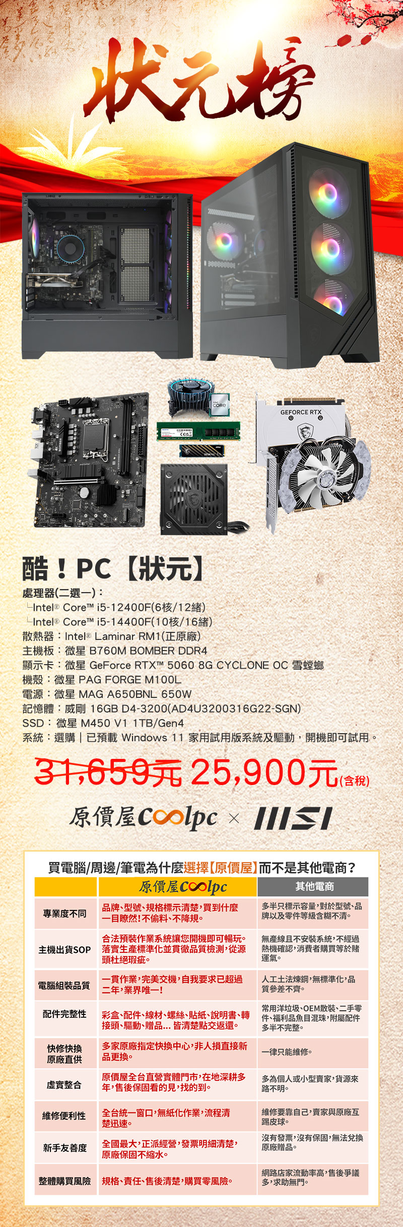 酷!PC【狀元】NT$31,659↘NT$25,900|限量 150 台