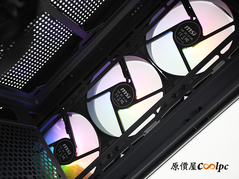 * 微星 PAG FORGE M100L 機殼:前 + 側雙玻璃面板設計,兼具質感與未來感,讓「雪螳螂」的動感視覺一覽無遺!內建 4 顆 ARGB 風扇,不僅質感加分,散熱效率也幫你做好做滿!不論是擺在桌面還是地上,都是全場注目的焦點!